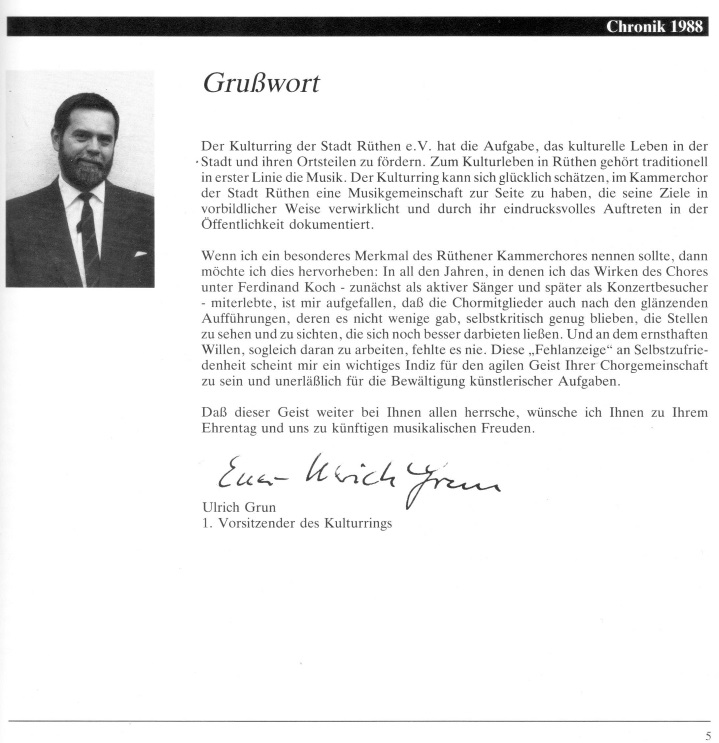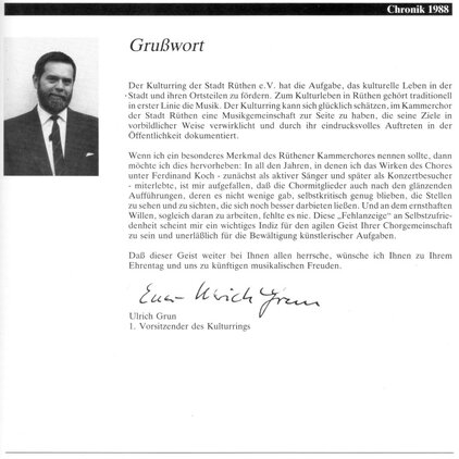 Wenn auch in den Zeitungsberichten zu diesem Jubiläumskonzert stand: "VHS-Chor hat auch den Schritt zur Moderne geschafft" - wir sangen damals u.a. zum erstenmal die "Schmunzelnden Weisheiten" von H. J. Rübben - so hatten wir doch schon mit den Proben für das Weihnachtsoratorium begonnen, das dann am 7.12.1973, also in diesem Jubiläumsjahr, in der Johanneskirche aufgeführt wurde. Die Solisten waren Anne-Marie Kunz, Alt, Anton Maxen, Tenor und Dr. Franz Müller-Heuser, Baß. Auf der Trompete brillierte wiederum, wie schon zuvor in allen Messias-Aufführungen dar excellente Heinrich, Freiherr von Senden aus Hannover, der in den folgenden Jahren noch mehrmals in Rüthen zu Gast war. Nur sehr schwer konnten wir uns von diesem Werk trennen und freuten uns sehr, es im Jahr darauf am 12.12.1974 in Horn-Millinghaus und am 13.12.1974 in Warstein wiederholen zu können. In Horn-Millinghaus mußten wir während der ganzen Aufführung auf den Pauker verzichten, der stattdessen nach Horn bei Detmold gefahren war. Und dabei ist gerade für das Weihnachtsoratorium die Pauke unerläßlich! Am 23.5.1975 gab sich der Chor dann einmal ganz anders. In Verbindung mit den 2 Schulchören des Städt. Gymnasiums Rüthen ging Carl Orffs "Carmina burana" in der Stadthalle Rüthen vor ausverkauftem Haus über die Bühne. Ruth Siebenborn, Sopran, Erich Wenk, Baß, und an 2 Klavieren Annie Weichert und Birgit Schwingenheuer waren mit von der Partie. Die Presse (Gerhard Bielefeldt) sprach von einer bravourösen Leistung der vereinigten Chöre. Und in diesem Jahr hatten wir zu unserer großen Freude wiederum zweimal Gelegenheit, das Weihnachtsoratorium aufzuführen, und zwar am 5.12.1975 in Niedermarsberg und am 14.12.1975 in Brilon. Besonders die Briloner Aufführung stellt einen besonderen Höhepunkt in unserer Konzerttätigkeit dar. Wenn die Presse von "rauschendem Schlußbeifall" spricht, so muß man dazu noch sagen, daß die große Kirche bis auf den letzten Platz besetzt war. Ca. 800 Personen sollen es hier gewesen sein. Wiederum in der Stadthalle Rüthen stellte sich unser Chor dann am 12.11.1976 mit Haydns Jahreszeiten vor. Zu den uns schon bekannten Solisten Jan Thompson - übrigens ein Schwarm unserer Damen - und Dieter Mohme wurde die Sopranistin Hildegard Berkenhoff verpflichtet. Nach dem Motto: "Auf Bewährtes kommt man immer wieder gerne zurück" lagen auch für diese Einstudierung Einladungen aus Brilon und Niedermarsberg vor. Zusätzlich gastierten wir erstmals in der Theateraula Belecke am 17.11.1976. Unser Auftritt im Westdeutschen Rundfunk am 2.4.1978 beim Großen Platzkonzert in Kallenhardt war sicher nicht weltbewegend, kann hier aber doch mit angeführt werden. Im Jahr 1978 waren wir dann mit der C-Dur-Messe von Beethoven, nach der Premiere in Rüthen am 1.12.1978 wiederum auf Reisen in Richtung Niedermarsberg und erstmals auch nach Niedersfeld. Inzwischen waren die Männer des MGV Cäcilia Geseke auf unseren Chor aufmerksam geworden. Zu gerne wollten sie doch einmal wissen, was der Koch denn doch in Rüthen wohl für einen Chor hatte. So kam es zu einem Gemeinschaftskonzert unter dem Motto "Lieder der Völker" am 3.2.1980 in Geseke. Lt. Programm zu diesem Ereignis nennen wir uns inzwischen "Gemischter Chor". Wir waren zu diesem Zeitpunkt auf 80-100 Stimmen angewachsen. Erfreulicherweise sangen sehr viele Jugendliche mit. Wiederum mit einem Haydn - diesmal der Schöpfung - einem Werk, an dem kein größerer gemischter Chor vorbeikommt, waren wir dann am 14.3.1980 zum 2. Mal in der Belecker Theateraula. In Rüthen gingen wir mit diesem Werk statt in die Schützenhalle wie bei den Jahreszeiten doch lieber in die Johanneskirche. In Niedermarsberg waren wir dann am 16.3.1980. 1n der schönen Probsteikirche hatten wir ja schon fast Hausrecht. Von den Solisten Irene Hamman, Leo Hönscheid und Jesse Coston kam besonders der farbige Baß beim Publikum gut an. Und am 21.1.1981 war es dann endlich so weit! Der Chor sollte "offiziell" werden. Nach 18 Jahren der Privatwirtschaft traf man sich im Hause Steinwachs um die Satzung für die in Aussicht genommene 1. Generalversammlung vorzubereiten. Mit dem kleingeschriebenen "man" ist der Vorstand gemeint, der von den Chormitgliedern ziemlich einstimmig am 12.3. desselben Jahres gewählt worden war. Und unter der Leitung des 1. Vorsitzenden, Herrn Dieter Müller, fand dann am 3.12.1981 bei Knickenberg-Dahl die 1. Generalversammlung statt. Eigentlich will ich an dieser Stelle meine Chronik beenden, denn jetzt tritt ja der Vorstand, der sich inzwischen übrigens bestens bewährt hat, voll in Aktion. Nur zum neuen Namen des Chores will ich noch etwas sagen, der wurde auf dieser ersten Generalversammlung nämlich immer noch nicht gefunden. Man einigte sich vorerst auf "Chor der Stadt Rüthen" und wie ich die Dinge sehe, wird es vorerst wohl dabei bleiben. Allerdings möchte ich zum Schluß dann noch von unserer Johannespassion sprechen, die am 20.3.1982 in Rüthen nach fast 2-jähriger Probenzeit mit sehr großem Erfolg aufgeführt werden könnte. Zum erstenmal hatten sich alle Chormitglieder aktiv an der Werbung und an den sonstigen Vorarbeiten beteiligt, was denn auch reiche Früchte trug. Die Kirche war übervoll, und noch ca. 100 Stühle mußten zusätzlich aufgestellt werden. Den Reigen von 4 Aufführungen dieses Werkes hatten wir am 12.3.1982 in Belecke eröffnet. Am 19.3.1982 waren wir dann auf Einladung von Pfarrer Petermann in Detmold, am 24.3.1982 in Niedermarsberg. Der Erfolg dieser Aufführungen entschädigte uns für alle Mühen. Wohl jeder spürte: Es hatte sich gelohnt. Die Solisten Arthur Janzen, Evangelist, Alfred Kornemannn, Marusa Xyni und Anita Freitag begleiteten uns zu allen Aufführungen, ebenso Wolf-Eckhard Richartz und sein Cembalo. Und wenn ich nun herausragende Konzerte benannt habe, so muß ich eigentlich auch unseren Einstieg in die Rüthener Karnevalsszene erwähnen. Dank der Aktivitäten von Textdichter und Chormitglied Franz Kaps h