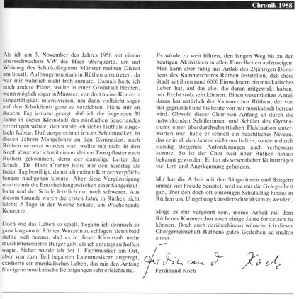Genau am 4.10.1963 begann alles. Eine Arbeitsgemeinschaft "Singekreis" wurde unter der Schirmherrschaft der Volkshochschule Lippstadt, Ortsring Rüthen, ins Leben gerufen. Und an diesem ersten Donnerstag, dem noch so viele Donnerstage folgen sollten, daß dieser Tag in Rüthen inzwischen zu einer "heiligen" Institution geworden ist, konnte ich bereits 15 Sangesfreudige begrüßen, von denen heute noch Frau Czienskowsky, Frau Polzin, Herr Rüther und das Ehepaar Gockel aktiv sind. Bald schon kamen immer neue hinzu, der Chor formierte sich und konnte bereits am 18.12.1964 seinen ersten Schritt in die Öffentlichkeit tun. Es war ein Adventskonzert in der Nikolauskirche mit den Kantaten "Kommst du, Licht der Heiden" und "Alles was ihr tut" von Dietrich Buxtehude, der Kantate "Machet die Tore weit" von Boxberg, einigen Chorälen von Bach und 2 Orchesterstücken von Rosenmüller und Mozart. Mitwirkende waren neben dem damals schon bestehenden hauseigenen Orchester 2 Solisten aus eigenen Reihen. Dagmar Neumann, Sopran, und Bruno Rüther, Tenor. Der Chor nannte sich zu diesem Zeitpunkt der Einfachheit halber "Singekreis der Volkshochschule Rüthen", florierte aber zahlenmäßig, machte musikalische Fortschritte und nahm zielstrebig immer größere Aufgaben in Angriff. Nebenher ergaben sich zahlreiche Möglichkeiten der musikalischen Betätigung aus den verschiedensten Anlässen. So sang der Chor beispielsweise, neben seinem großen Jahreskonzert zur Eröffnung der Kreisvolkshochschule im Oktober 1969, in Primizfeiern, aus Anlass der Verleihung der Ehrenbürgerschaft an Rektor Henneböle, zur Einweihung der Johanneskirche nach erfolgtem Umbau, zur Einweihung der neuen Orgel, beim Schulfest in Gymnasium, zur 775-Jahr-Feier der Stadt Rüthen, auf Freundschaftssingen in der Nachbarschaft und schon bald regelmäßig in der Mitternachtsmesse am Heiligabend in der Johanneskirche. Und diese kurze Aufzählung ist natürlich nicht vollständig. Unser Chor hat in den nunmehr 20 Jahren seines Bestehens aus welchem Anlass auch immer größere Auftritte in der Öffentlichkeit gehabt, in Rüthen und Umgebung, ist somit aus dem kulturellen Leben unserer Stadt eigentlich nicht mehr wegzudenken. Und wie ganz nebenbei wurde er zu einem Fast-Reisechor, denn auch die Städte rundum wurden auf uns aufmerksam und luden uns zu den verschiedensten Anlässen ein. So sangen wir in den vergangenen Jahren Konzerte in Warstein, Belecke, Störmede, Bökenförde, Horn-Millinghaus, Körbecke, Liesborn, Niedermarsberg-Brilon, Winterberg, Olsberg, Kallenhardt, Niedersfeld, Hoinkhausen, Willingen, Detmold, Steinhausen, Oestereiden, Erwitte, Anröchte und nicht zu vergessen Alme. Es ist unmöglich, all diese Auftritt im einzelnen zu benennen. Interessierte können aber das vollständige Verzeichnis gerne bei mir einsehen. Die Anfangsjahre waren sicherlich die schwierigsten für die Sänger und auch für den Dirigenten. Es gab noch keinen Fundus auf den man zurückgreifen konnte, alle Werke mußten neu einstudiert werden. Aber am 25.1.1969 stand dann das erste größere Werk, die Krönungsmesse von Mozart, die mit den Solisten Lotte Koch-Gravenstein, Sopran, Adelheid Berger, Alt, Alfred Fackert, Tenor und Dr. Franz Müller-Heuser, Baß, in der Nikolauskirche aufgeführt wurde. Der Chor nennt sich aus unerfindlichen Gründen nun offiziell "Volkshochschulchor", ist aber immer noch ohne Vorstand, Dirigent und Manager in einer Person bin immer noch ich. Auf dem Programm dieses Konzertes steht: "Der Eintritt ist frei, um einen Unkostenbeitrag wird gebeten". Wir hatten also von Anfang an unsere Schwierigkeiten mit den Preisen und tun uns bis heute noch schwer mit unserem Eintrittsgeld. Gemessen an dem was andere Chöre an Eintrittsgeld nehmen sind wir bis heute Waisenknaben geblieben. Die Presse zu diesem Konzert: "Volkshochschulchor übertraf sich selbst". Das war in den vergangenen Jahren natürlich nicht immer so, aber ich sehe nicht ein, warum ich ausgerechnet heute darüber sprechen soll. Da wir doch auf 20 Jahre einer Aufwärts-Entwicklung zurückblicken können, möchte ich eigentlich eine positive Bilanz ziehen und diejenigen Aufführungen erwähnen die es verdienen und besonders Höhepunkte in unserer Konzerttätigkeit herausstellen. Am 9.5.1971 war nun der Messias von Georg Friedrich Händel aufführungsreif. Damit sollte zum ersten Mal den Rüthenern ein abendfüllendes Oratorium angeboten werden. Dem Chor machte die Arbeit zu diesem Werk große Freude. Aber es war eben auch "harte" Arbeit. Aber auch die Rüthener als Publikum mußten lernen. Schließlich waren sie solche Konzerte in ihren eigenen Mauern nicht gewohnt. Sie mußten an diese Musik herangeführt werden und lernen, eine gewisse Hemmschwelle zu überwinden, damit sie treue Konzertbesucher werden konnten. Dieser Prozess gestaltete sich mühevoll und Rückschläge und Enttäuschungen mussten von uns verkraftet werden. Aber es hat sich gelohnt, das bewies die übervolle Kirche bei der Johannespassion im Frühjahr 1982: Es sind nicht nur positive Ansätze da, nein, die Rüthener sind auch wirklich zu aktivieren. Die Presse war von der Messias-Aufführung und den Solisten Lotte Koch-Gravenstein, Sopran, Inge Pittler, Alt, Jan Thompson, Tenor und Erich Wenk, Baß, begeistert. Überschrift: "Rüthens Musikereignis des Jahres". Auch die Stadt Rüthen war offiziell angetan. Es kam ein Brief von Bürgermeister Kösters mit Glückwunsch und Blumen. Das waren noch Zeiten. Generalprobe zu diesem Konzert war eine Aufführung am Vortage in Störmede vor leider sehr wenig Zuhörern. Weitere Aufführungen folgten am 18.9.1971 in Warstein und am 19.9.1971 in Anröchte. Zu diesem Zeitpunkt zählte der Chor etwa 50-60 Stimmen, nannte sich immer noch Volkshochschulchor, ich war immer noch Dirigent und Vorstand in einer Person. Am 23.10.1971 endete dann der Messias-Reigen in Erwitte. Der Kirchturm der dortigen Laurentiuskirche, schief aber fest seit Jahrhunderten, hatte sich ausgerechnet