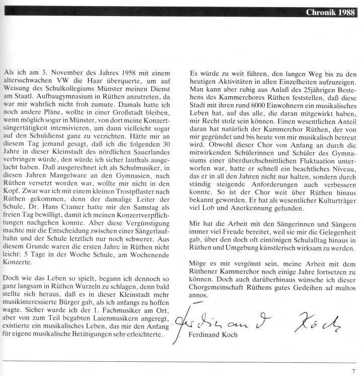 Der Kammerchor Rüthen wurde am 4.10.1963 als ''Singekreis der Volkshochschule'' von Ferdinand Koch gegründet, der den Chor bis zu seinem Tod im Jahre 1990 leitete. Anlässlich des 20jährigen Chorjubiläums verfasste Herr Koch die nachfolgend abgedruckte Chronik.