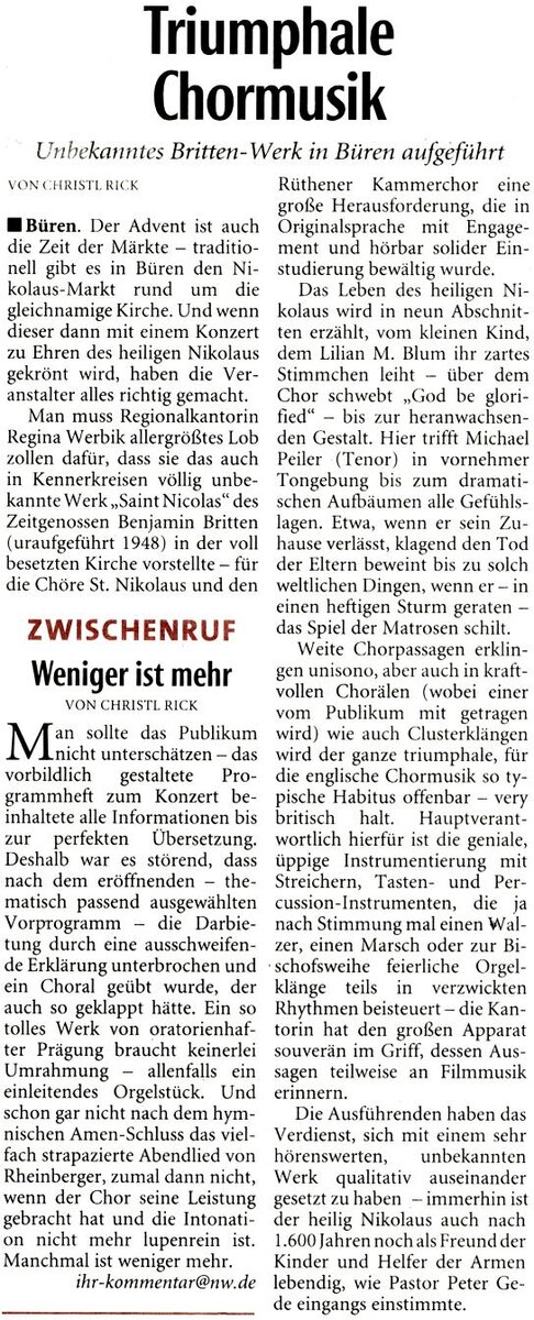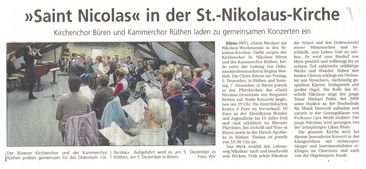 „Saint Nicolas“ am Nikolaus-Wochenende in den Nikolaus-Kirchen: Dafür sorgen der Kirchenchor St. Nikolaus Büren und der Kammerchor Rüthen, beide unter Leitung von Dekanatskirchenmusikerin Regina Werbick. Das „Saint Nicolas“-Oratorium von Benjamin Britten (1913-1976) ist eines der ganz wenigen Werke, die sich des berühmten Bischofs kompositorisch annehmen. In Chor- und Solostücken wird dessen Lebensweg nacherzählt und sein Wirken beschrieben. Neben den zwei Chören erklingt dabei ein Orchester aus Streichern, vierhändig gespieltem Klavier, Schlagwerk und Orgel. Die Rolle des Bischofs Nikolaus singt der junge Tenor Michael Peiler (Detmold). Die ganze Kirche wird bei diesem besonderen Konzert in das Klangerlebnis mit einbezogen: Sänger und Instrumentalisten erklingen im Chorraum wie auch von der Orgelempore hinab. Abgerundet wird das Programm durch doppelchörige Motetten von Johann Sebastian Bach, Benjamin Britten und Samuel Scheidt.