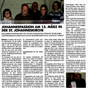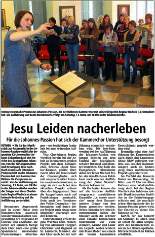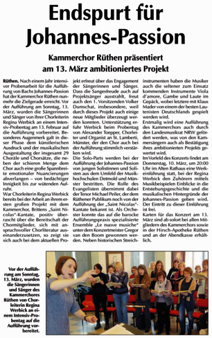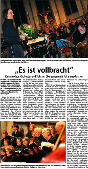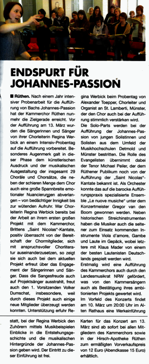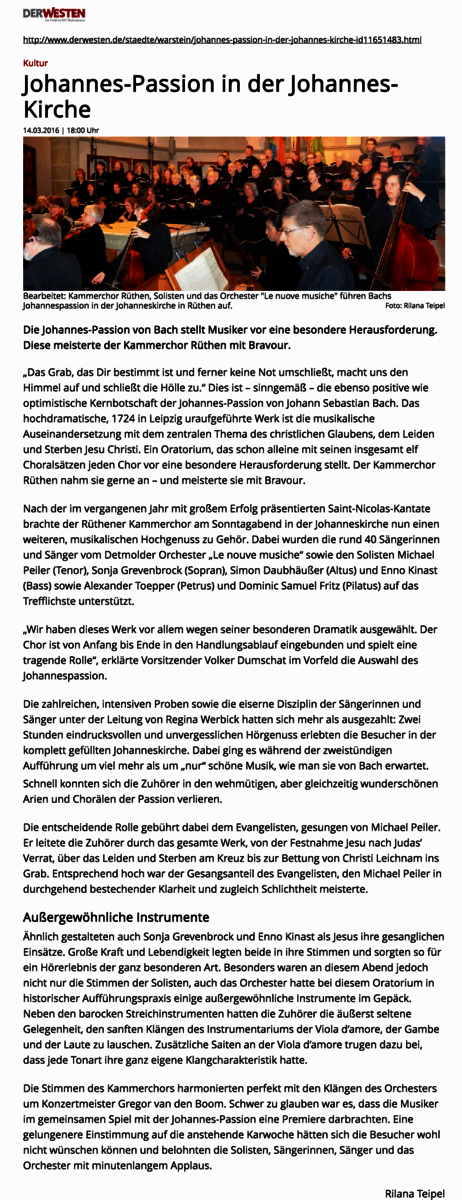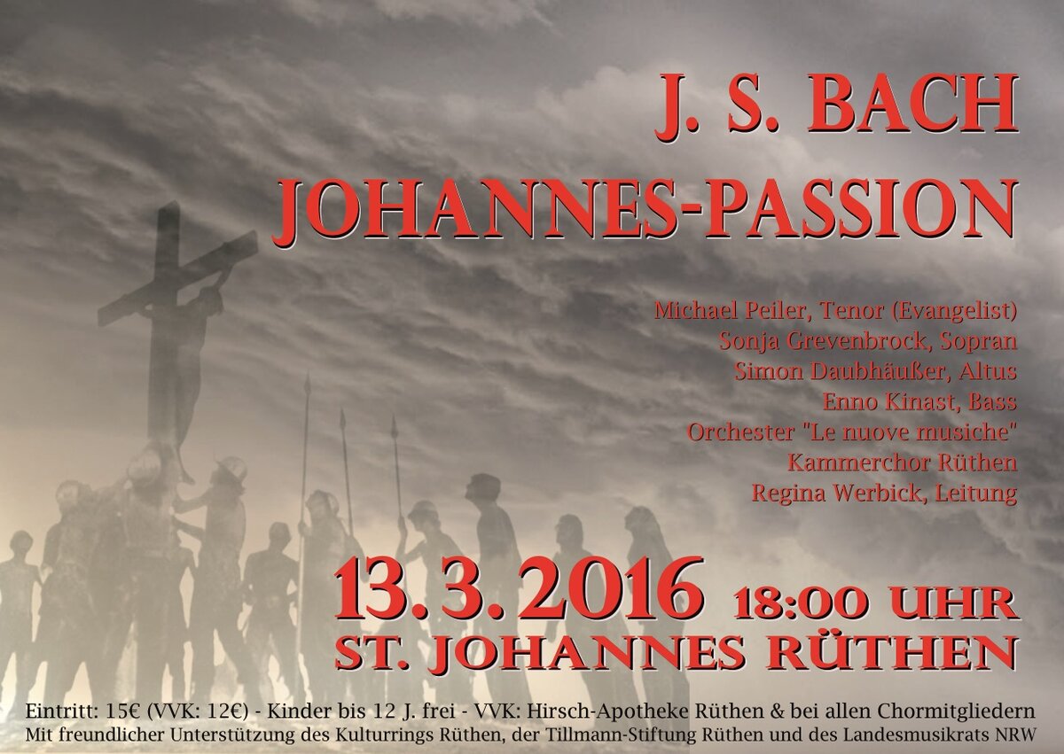 Wenige Wochen nach der Rüthener Erstaufführung der „Saint Nicolas“-Kantate von Benjamin Britten begann der Kammerchor Rüthen mit den Vorbereitungen für die nächste Premiere: Erstmalig sollte im März 2016 die Johannespassion von Johann Sebastian Bach in historischer Aufführungspraxis aufgeführt werden. Neben der Verwendung von Barockinstrumenten und der entsprechenden Spielweise durch das Orchester bedeutete dies für den Chor hauptsächlich eine Auseinandersetzung mit barocker Phrasierung und der historischen Stimmung. Die besondere Herausforderung liegt bei diesem Werk jedoch in den hochdramatischen Chorsätzen, in denen in intensiver Weise die Rolle des Volkes bei der Festnahme, Verurteilung und Kreuzigung Jesu Christi hervorgehoben wird. Entsprechend plante der Chor eine über einjährige Vorbereitungszeit, in der Chorleiterin Regina Werbick das Werk mit den Sängerinnen und Sängern im Rahmen der wöchentlichen Chorproben, in Stimmproben, sowie bei einem ersten Probewochenende zu Beginn der Sommerferien auf Haus Düsse erarbeitete. Die nächste Intensivprobenphase fand am 13. Februar statt. Verstärkt wurde der Chor durch einige erfahrene Projektsängerinnen und -sänger. Das junge Solistenquartett rekrutiert sich aus dem Umfeld der nahegelegenen Musikhochschulen Detmold und Münster, wobei der Evangelist Michael Peiler dem Rüthener Publikum bereits durch die Aufführung der Saint-Nicolas-Kantate bekannt war. Das Orchester "Le nuove musiche" unter Konzertmeister Gregor van den Boom setzt sich aus ausgewiesenen Barockspezialisten zusammen, die neben den obligatorischen barocken Streichinstrumenten auch das seltener eingesetzte Instrumentarium von Viola d'amore, Gambe und Laute im Gepäck hatten. Letztere wurde mit Klaus Mader von einem der besten Lautenisten Deutschlands gespielt. Im Vorfeld des Konzertes fand am 10. März eine Werkeinführung statt, in der sich die Zuhörer vorab mit der Musik vertraut machen konnten. Impressionen von der Generalprobe und der Aufführung finden Sie in unserer Bildergalerie.