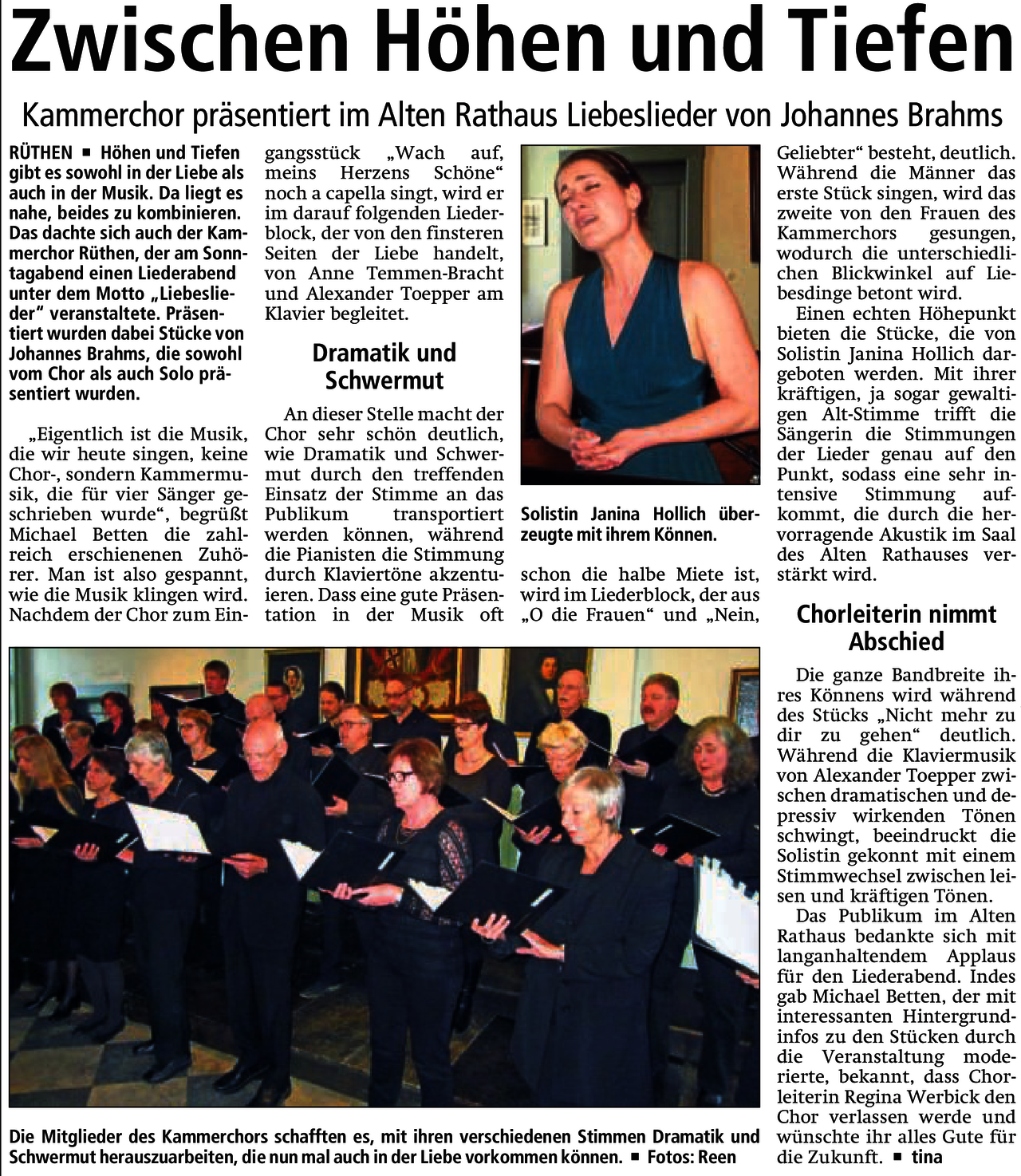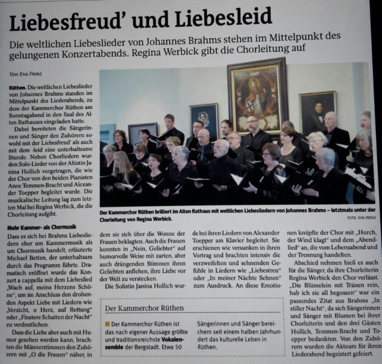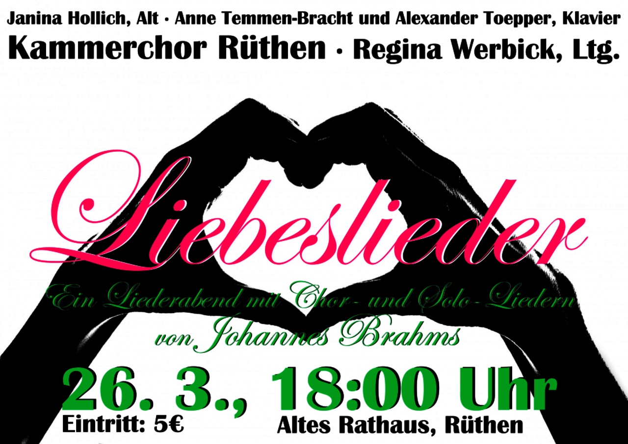 Der Kammerchor Rüthen widmet sein nächstes Konzert ganz dem vokalmusikalischen Schaffen des Komponisten Johannes Brahms (1833-1897). Der Romantiker Brahms hat ein großes Werk für Chor und Gesangssolisten hinterlassen, aus dem der Kammerchor am 26. März um 18:00 Uhr eine kleine Auswahl im Saal des Alten Rathauses präsentieren wird. Im Mittelpunkt des Konzerts stehen die beiden Sammlungen von „Liebesliedern“, in denen Brahms Liebesgedichte aus der Feder meist unbekannterer Autoren vertont hat. Hinzu kommen Chorlieder aus den Quartetten und den Zigeunerliedern. Als besonderes Highlight konnte die junge Altistin Janina Hollich gewonnen werden, die Preisträgerin des GFF-Wettbewerbes der Hochschule für Musik Detmold und Finalistin des Bundesgesangwettbewerbes Berlin ist. Janina Hollich wird Lieder für Singstimme und Klavier, ebenfalls aus der Feder von Johannes Brahms, darbieten. Begleitet werden sowohl der Chor als auch die Solistin von den beiden Pianisten Anne Temmen-Bracht und Alexander Toepper. Nach der Johannes-Passion im vergangenen Jahr, bei der ein großes geistliches Werk mit Orchester aufgeführt wurde, pflegt der Kammerchor mit diesem Konzert wieder den Kammergesang, der völlig andere Anforderungen an die musikalische Gestaltung stellt. Daher hat Chorleiterin Regina Werbick die Sängerinnen und Sänger erneut sorgfältig auf das Konzert vorbereitet und besonderes Augenmerk auf Artikulation und Sprachverständlichkeit gelegt. Eine Herausforderung stellen dabei diejenigen Lieder dar, die unbegleitet – a cappella – gesungen werden. Mit dem intensiven Studium solcher Stücke werden die Stimmen auch für künftig anstehende Werke mit Orchesterbegleitung geschult, mit deren Planung der Chor gleich nach dem Konzert am 26. März beginnen wird. Darüber hinaus freut sich der Kammerchor gemeinsam mit dem Partnerschaftsverein auf einen erneuten Besuch der Mid-Norfolk Singers am Himmelfahrtswochenende. Karten für das Konzert sind für 5€ an der Abendkasse erhältlich. Einlass ist ab 17:30 Uhr.