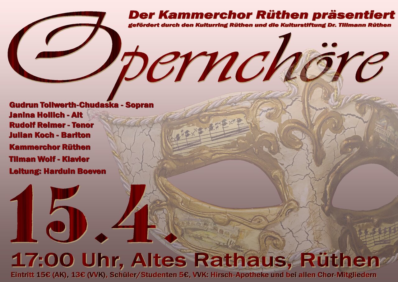 Einen Abend in der Oper können die Zuhörer am 15. April mit dem Kammerchor Rüthen erleben. Dabei werden Höhepunkte aus Opern vom Barock über die Wiener Klassik bis zur Romantik im stilvollen Ambiente des Rüthener Alten Rathauses präsentiert. Dass die bekanntesten Opernmelodien häufig nicht aus Soloarien stammen, sondern aus Chorstücken, liegt sicher zum Teil daran, dass die Komponisten nicht selten den Chören besonders eingängige Melodien in den Mund gelegt haben. Zum anderen sind diese Stücke aber auch vielfach von Amateurchören aufgeführt und somit verbreitet worden. Ganz in dieser Tradition wird auch der Kammerchor unter seinem Leiter Harduin Boeven dem Publikum die schönsten Melodien aus Opern von Mozart, Bizet, Verdi und anderen zu Gehör bringen. Mit auf dem Programm steht der berühmte Brautchor aus Wagners „Lohengrin“ und der Gefangenenchor von Verdi, aber auch weniger bekannte Stücke, z. B. aus Händels „Alcina“ und Donizettis „Lucia di Lammermoor“. Die anspruchsvolle instrumentale Seite des Konzerts wird von dem Pianisten Tilman Wolf am Flügel bestritten. Zu einem vollwertigen Opernabend wird das Konzert durch ein Solisten-Quartett aus Gudrun Tollwerth-Chudaska (Sopran), Janina Hollich (Alt), Rudolf Reimer (Tenor) und Julian Koch (Bariton). Gudrun Tollwerth-Chudaska ist dem Rüthener Publikum u. a. aus Aufführungen von Mozarts c-moll-Messe, Mendelssohns „Elias“ und Orffs „Carmina burana“ in bester Erinnerung. Janina Hollich hat im vergangenen Jahr bei einem Abend mit Brahms-Liedern mit ihrer eindrucksvollen Alt-Stimme und ihrer intensiven Interpretation brilliert. Der Tenor Rudolf Reimer gibt bei diesem Konzert sein Debut in Rüthen. Julian Koch kennen die Rüthener Musikliebhaber von vielen Kammerchor-Projekten, u. a. als „Elias“ in Mendelssohns gleichnamigen Oratorium. Die Zuhörer dürfen sich somit auf mitreißende Darbietungen, u. a. von Bizets berühmter „Habanera“ aus „Carmen“, freuen. Das Konzert beginnt um 17:00 Uhr. Karten sind im ermäßigten Vorverkauf (13 €, Abendkasse 15 €, Schüler und Studenten 5 €) über alle Chormitglieder und in der Hirsch-Apotheke verfügbar.