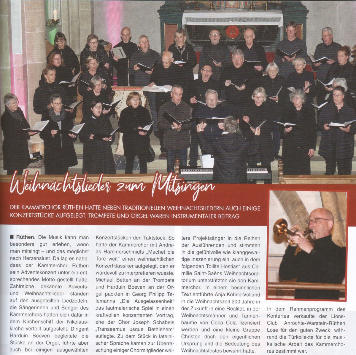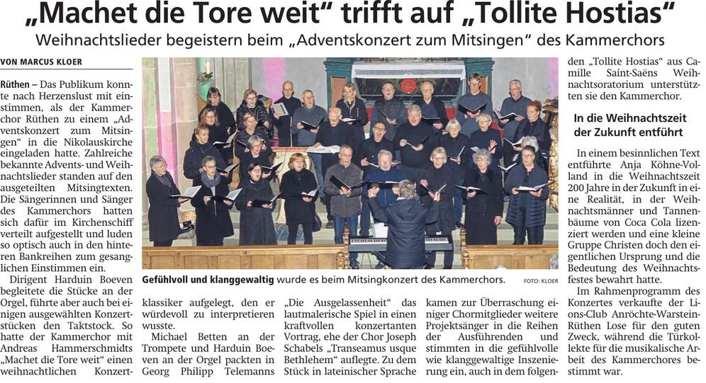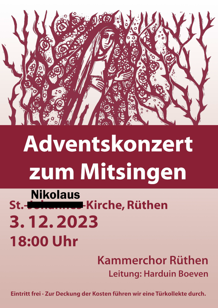 Am Sonntag, dem 3. Dezember 2023 (1. Advent) veranstaltet der Kammerchor ein Adventskonzert zum Mitsingen. Neben dem gemeinsamen, orgelbegleiteten Singen beliebter Adventslieder wird der Kammerchor auch einige konzertante Stücke aus dem weihnachtlichen Repertoire zu Gehör bringen. Die Veranstaltung beginnt um 18:00 Uhr in der Rüthener Nikolauskirche. Der Eintritt ist frei.