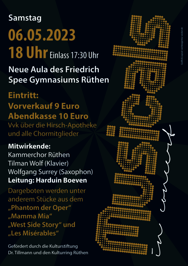 Karten für das Musicalkonzert sind wie immer in der Hirsch-Apotheke Rüthen sowie bei allen Chormitgliedern zum ermäßigten Vorverkaufspreis von 9€ (Abendkasse 10€) erhältlich. Konzertbeginn ist um 18:00 Uhr, Einlass ab 17:30 Uhr.